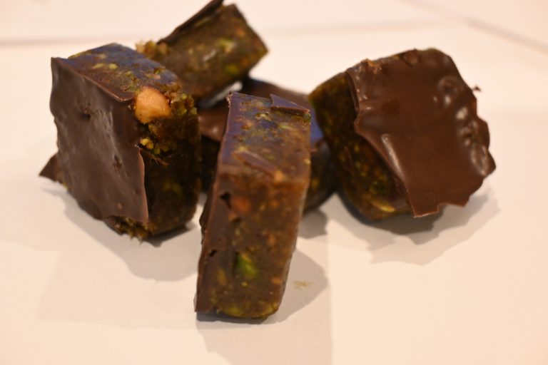 Ingredients: Dates, Pistachios, Dark Chocolate, Coconut oil . Contains: Tree nuts (Walnuts, Almonds). May Contain : Wheat, Soy, Other Nuts.
